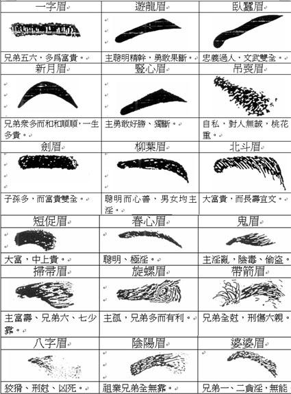 眉纹:眉上多直纹,是富贵之相,眉上多横纹,是穷苦之相。